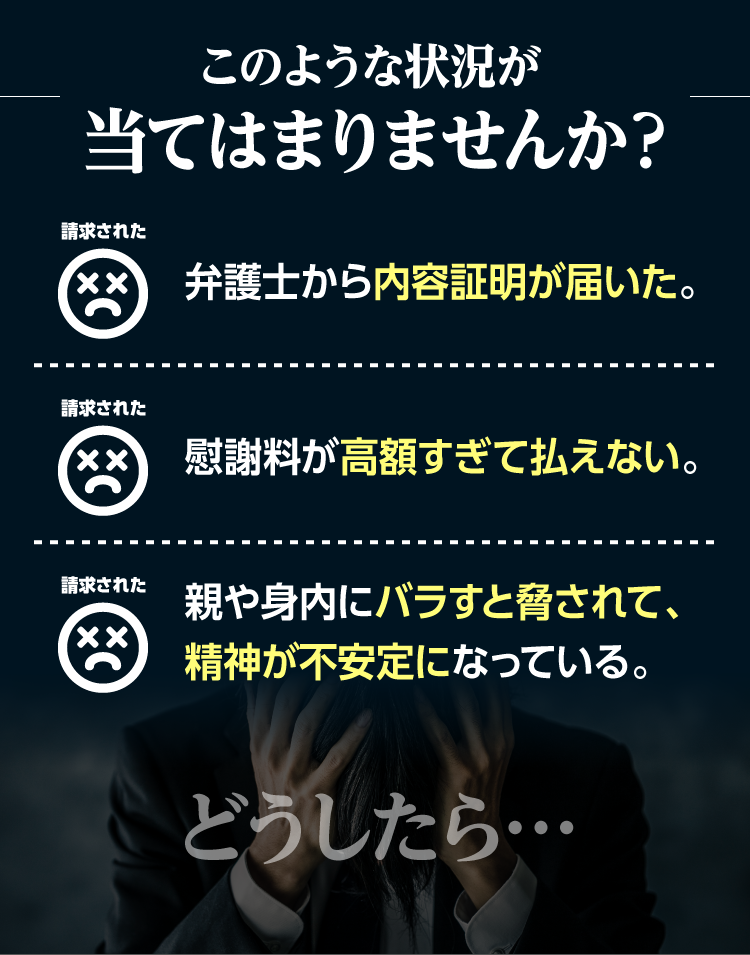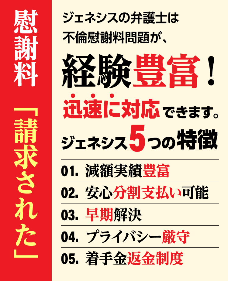- あなたが不倫していたことが事実だったとしても、相手の請求通りの金額を支払わなければいけないとは限りません。まずは、請求された金額が妥当かどうかを調べなければいけません。例えば、交際相手が既婚者とは知らなかった・むりやり肉体関係を強要された・相手の夫婦関係はすでに破綻していたなどのことがあった場合には、慰謝料を払わなくても済む場合もございますし、要求してきた金額を大幅に減額できるケースもございます。まずは弁護士法人ジェネシスであれば相談は無料ですのでお問い合わせください。