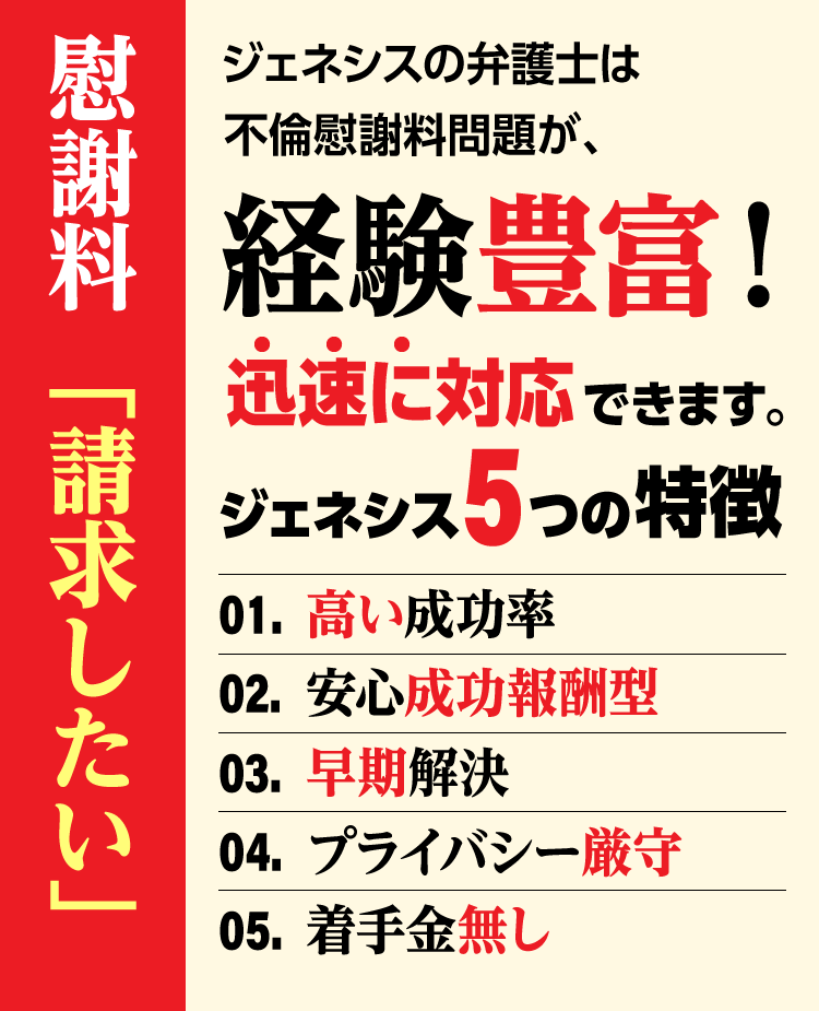 - 申し訳ございません。弁護士法人ジェネシスでは現在多くの慰謝料請求関連のお問い合わせを頂いておりまして、離婚のみのご相談はお受け出来ない状況でございます。