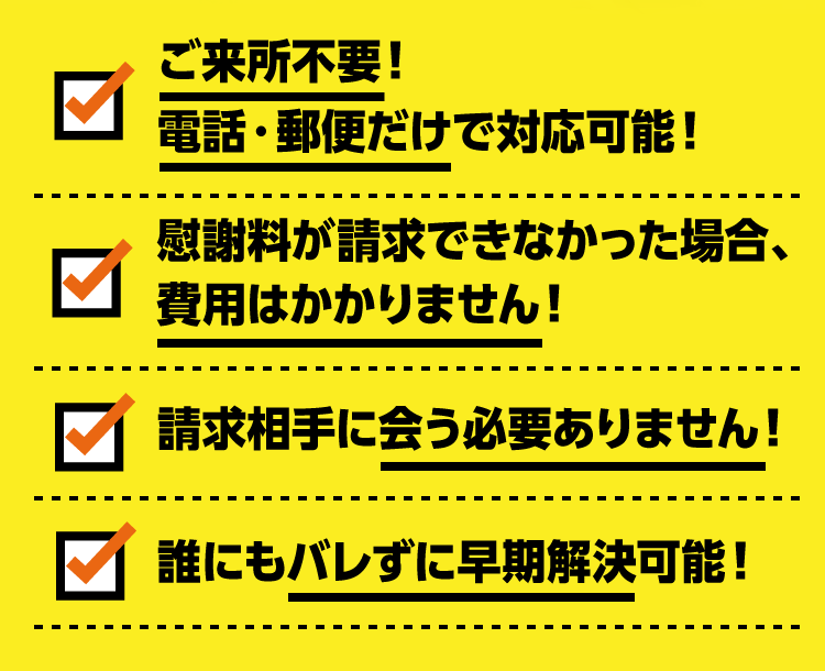 - 当事務所にお越し頂く必要はありません。電話、メール、郵送だけで請求は可能です。